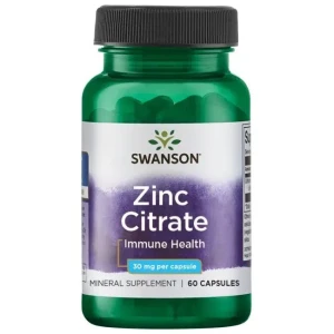 Suplement diety Swanson Cytrynian Cynku dostarcza 30 mg pierwiastkowego cynku w każdej kapsułce, co odpowiada 273% dziennej referencyjnej wartości spożycia (RWS). Cynk jest kluczowym minerałem wspomagającym wiele funkcji organizmu, w tym układ odpornościowy, zdrowie skóry, włosów i paznokci oraz syntezę DNA.